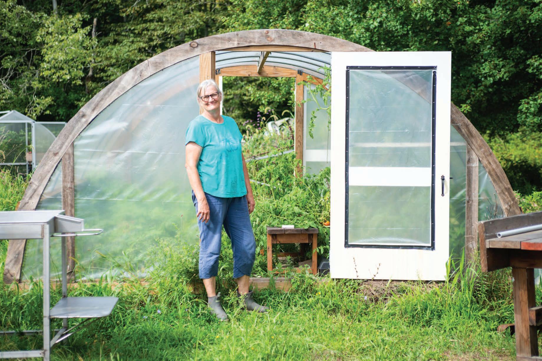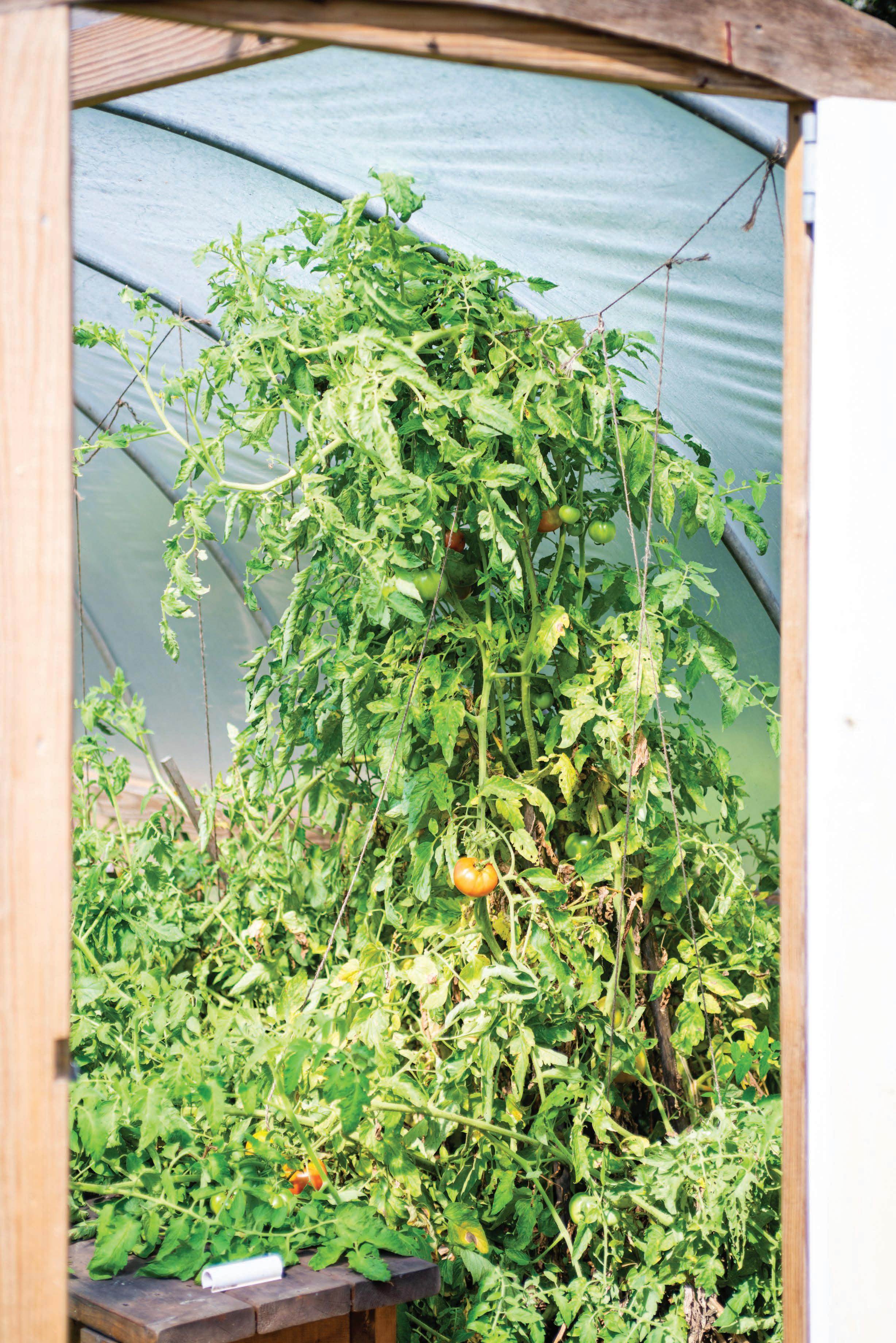 But a hoop house is not merely a sea son extender; it can also boost your peak harvest. At the height of summer, Marie’s hoop house is resplendent with bushy tomatoes, both for eating and for sauce. (Seed catalogues such as Johnny’s offer tomato varieties that perform best in hoop house or greenhouse conditions.) Rachael uses her hoop house not only for heat-hungry crops such as tomatoes