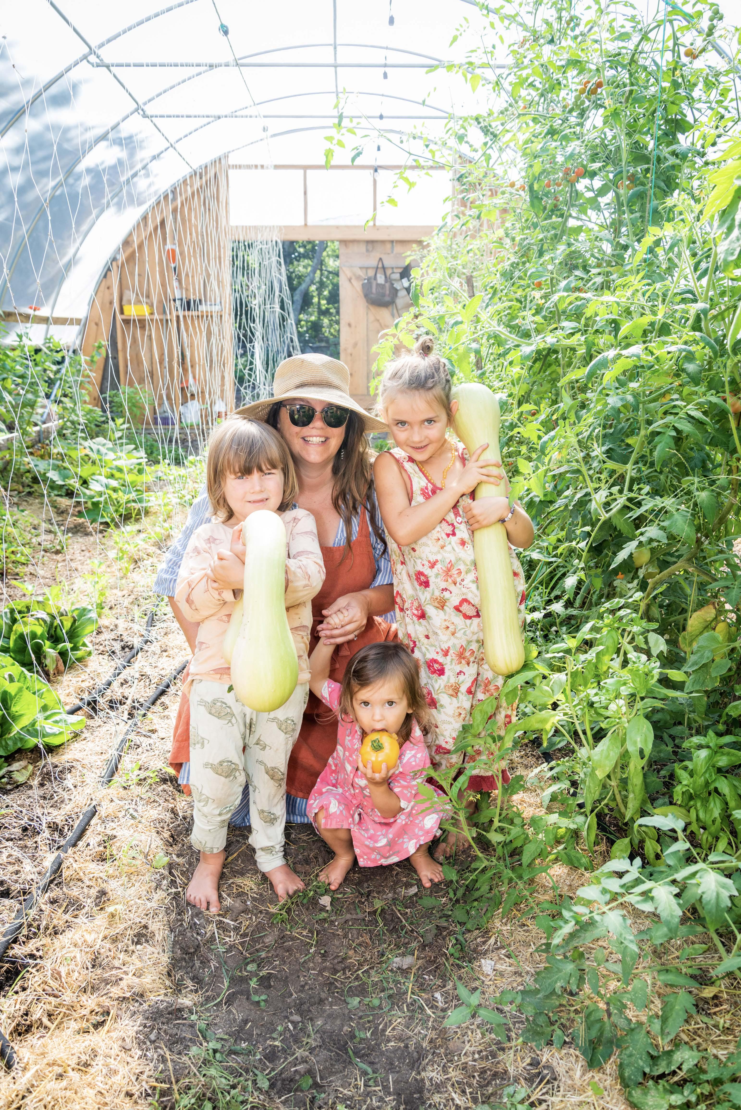Niko and Rachael Ewing (with Silas, Maizey, and Mirabai Ewing at right) are serious homesteaders and built their 20' by 36' Edgartown hoop house to last, with cross beams for roof support. In addition to annual crops like cherry tomatoes, the structure also protects tender perennials like Rachael's pomegranate tree and lemon verbena.