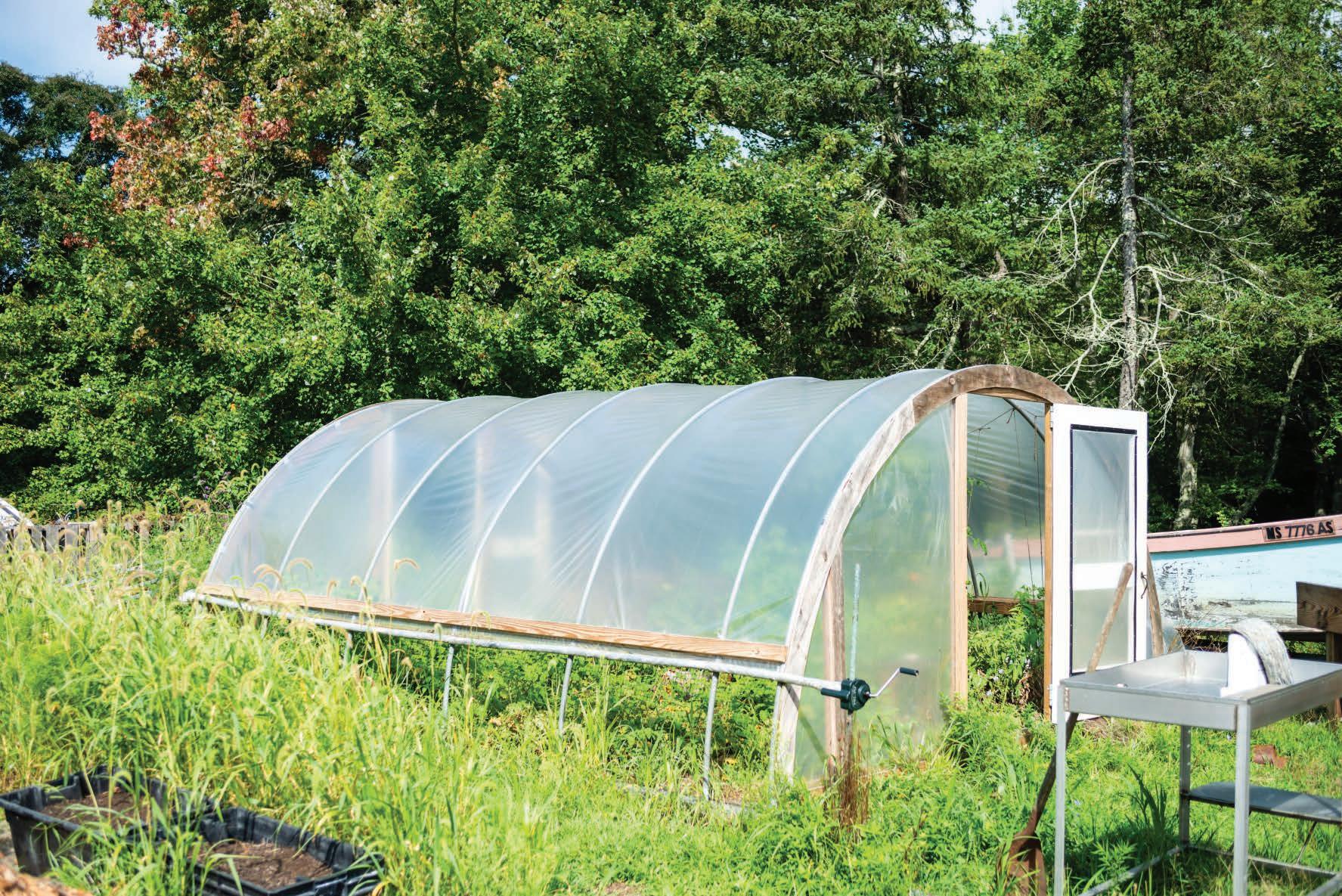 Rachael and Niko Ewing’s 20’ x 36’ behemoth in Edgartown requires more significant internal support. “Ours has crossbeams across the [interior of the] roof, which I highly recommend,” says Rachael, standing between her sevenplus-foot tall sun gold tomato plants. Their hoop house is constructed of both metal and wood elements, the latter par tially salvaged from trees cut down to make space for the structure.