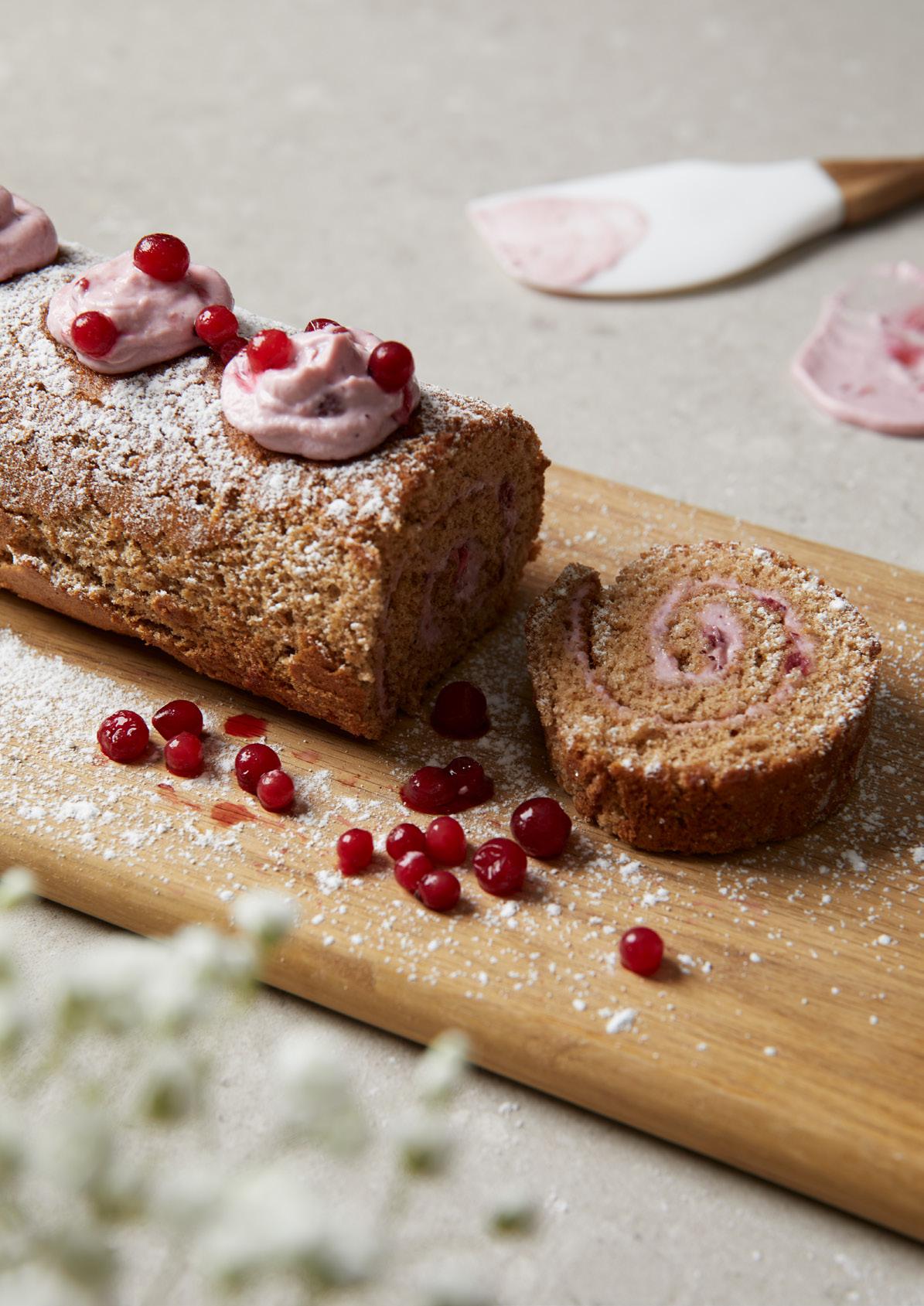 Bred krämen på kakan och rulla snabbt ihop med skarven nedåt. Rulla in kakan i papperet och låt svalna.