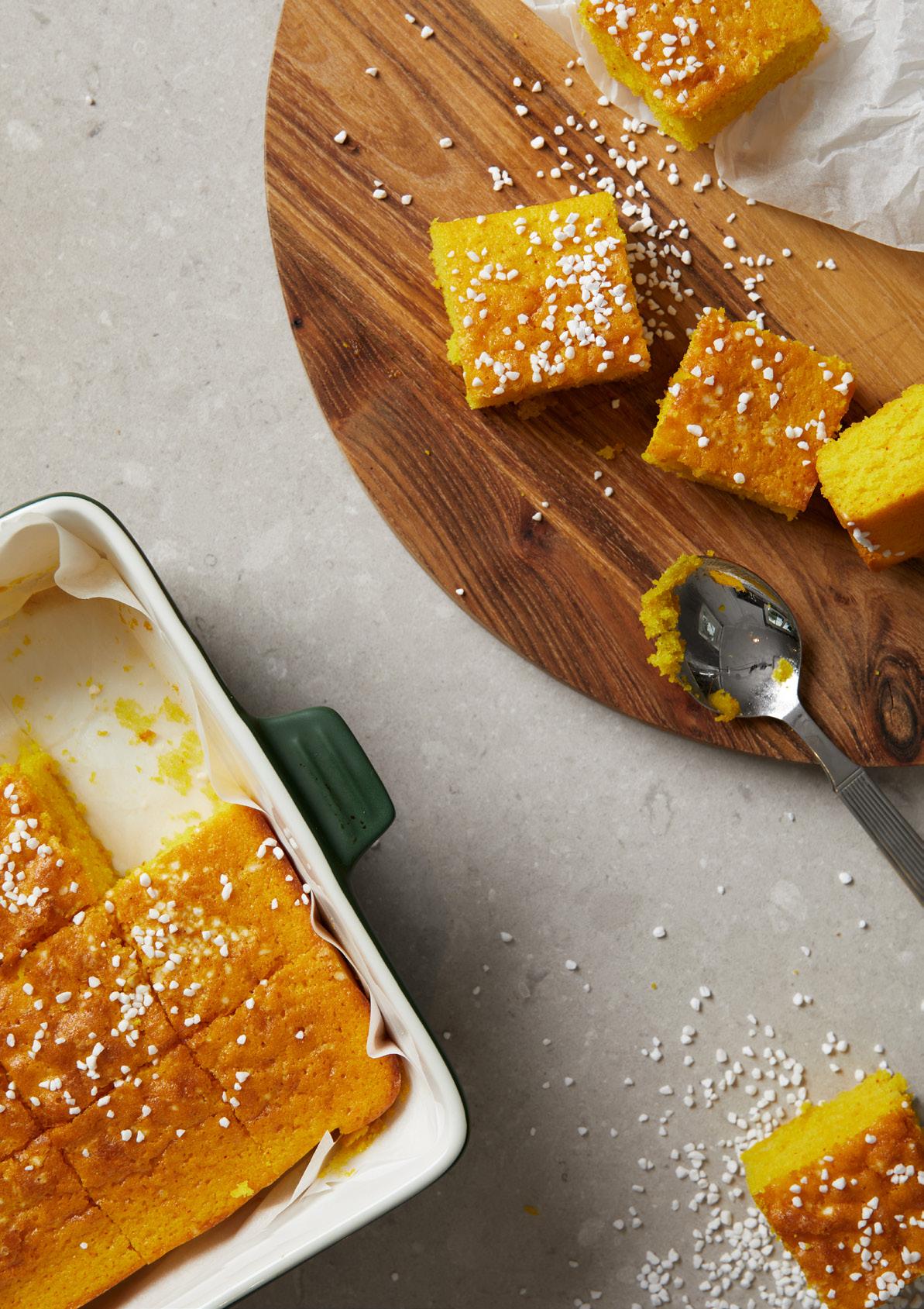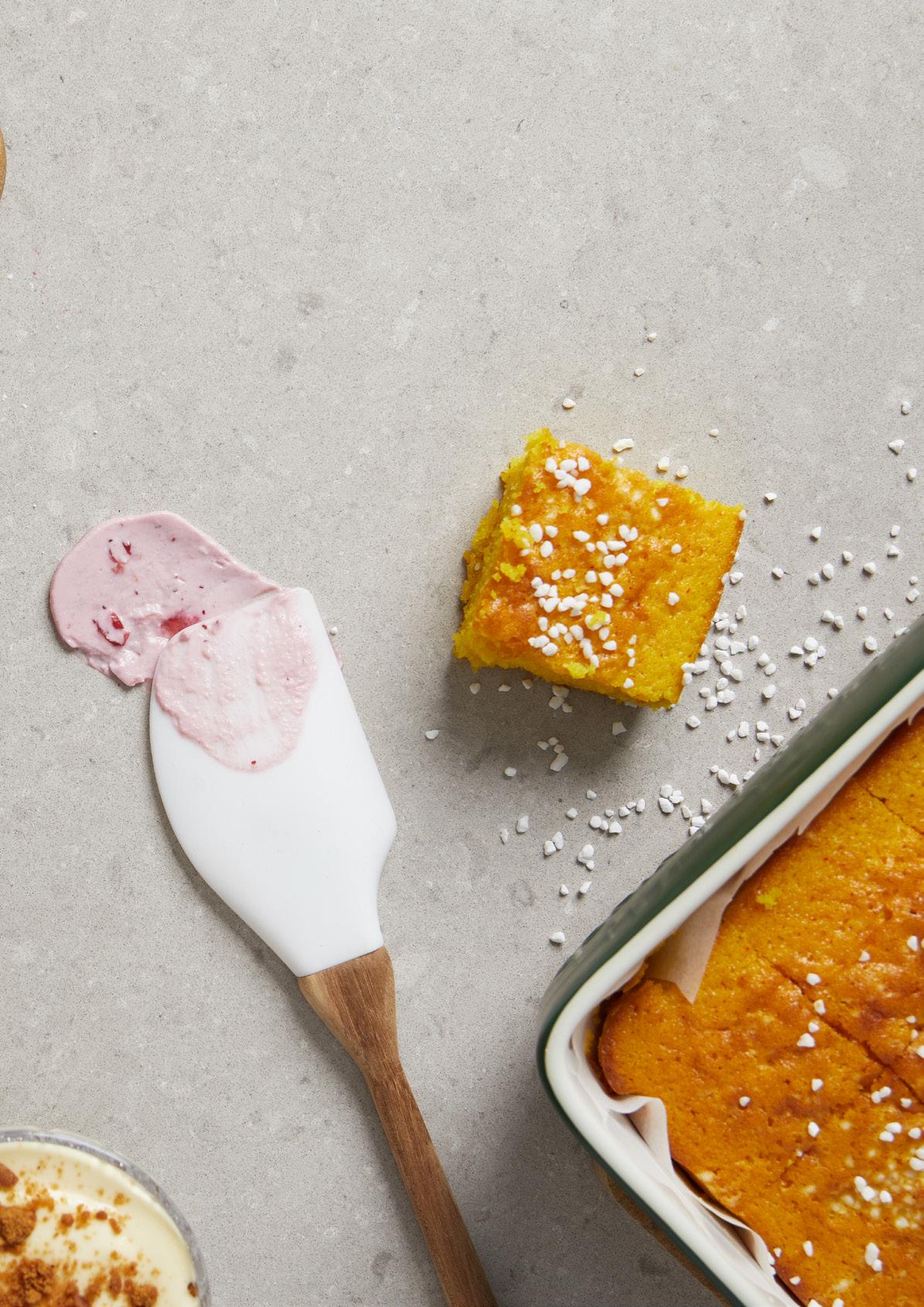 Häll smeten i långpannan och bred ut den jämnt. Grädda mitt i ugnen ca 5 minuter. Stjälp upp kakan på sockrat bakplåtspapper.