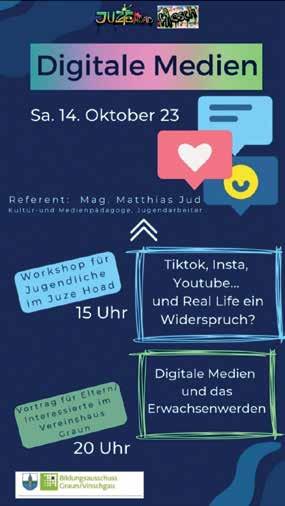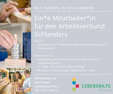Europa in der BASIS in der BASIS Interaktive EU-Projektmesse in Schlanders Interaktive EU-Projektmesse in Schlanders www.vinschgerwind.it www.vinschgerwind.it Poste Italiane SpA - Spedizione in Abbonamento Postale - periodicitá quattordicinale - D.L. 353/2003 (conv. in L. 27/02/2004 n° 46) art.1, comma1, NE BOLZANO Poste Italiane SpA - Versand in Postabonnement - erscheint 14-tägig - ges. Dekr. 353/2003 (abgeändert in Ges. 27/02/2004 Nr. 46) Art. 1, Komma 1, NE BOZEN GESUNDHEIT 2023 SPEZIAL Nr. 20 (461) 05.10.23 I.P. 19 Jg.