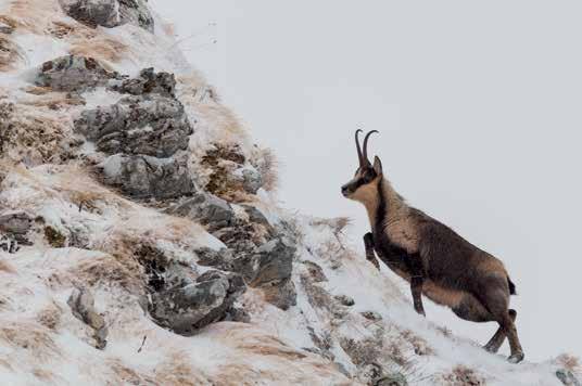 Die Gämse sucht im Winter windapere Grate auf. Der Wind bläst die karge Nah