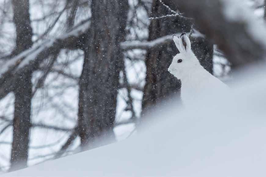 Der Schneehase tarnt sich vor seinen Fressfeinden Steinadler und Fuchs durch den Fellwechsel von sommers erdbraun auf winters schneeweiß. Auch seine Nahrung stellt er um.