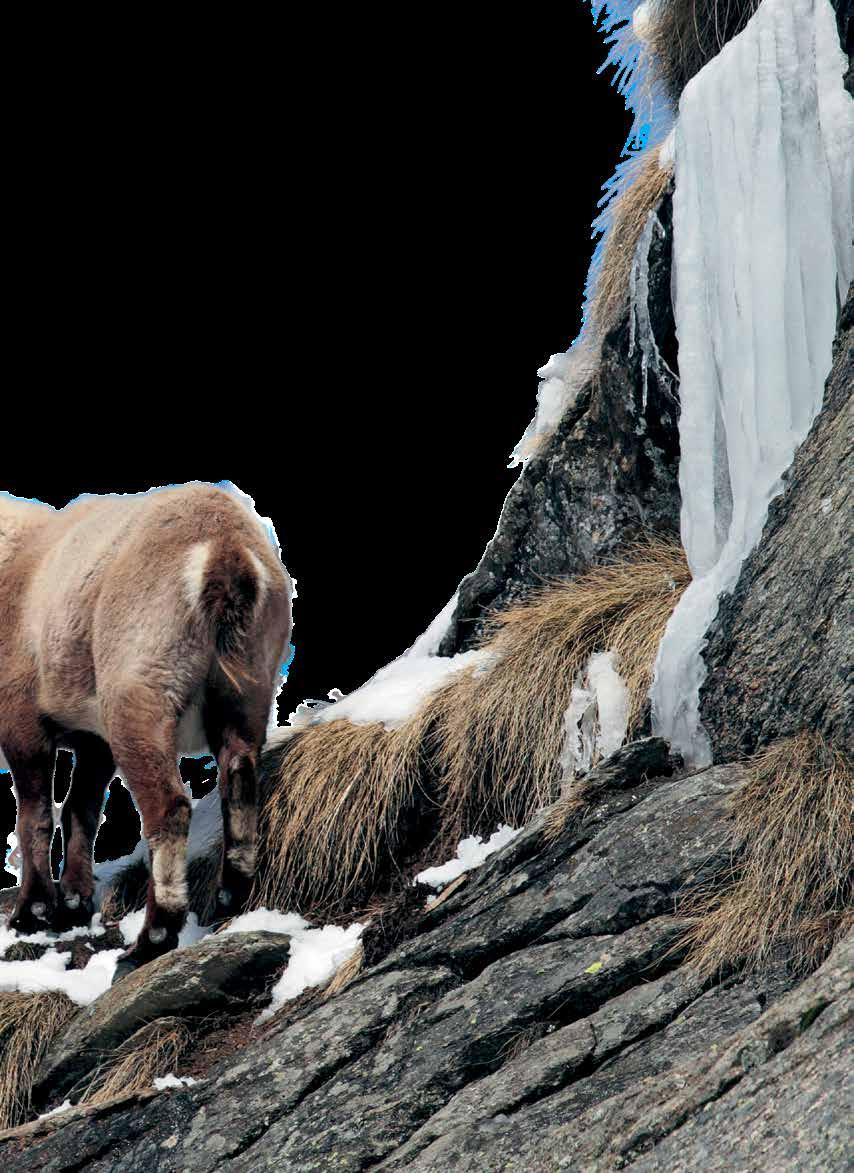 Das Steinwild ist an die Extrembedingungen des Gebirgswinters gut angepasst: Es sucht steile Südflanken auf, welche sonnexponiert sind und schnell ausapern.