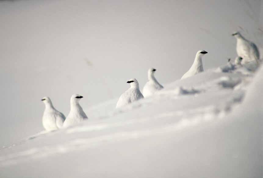Das Schneehuhn steigt von den Raufußhühnern am höchsten in die Berge auf. Es lebt oberhalb der Waldgrenze und gräbt sich bei eisiger Kälte in einen Schneeiglu ein.