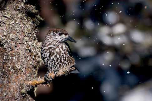 Oben: Der Tannenhäher oder die Zirmgratsch ist ein aktiver Überwinterer mit Vorratshaltung.