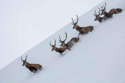 Die Rothirsche wechseln von den Sommereinständen in die Wintereinstände und stellen auch ihre Nahrung von Gräsern und Kräutern auf Baumnadeln und Rinden um. Hohe Schneelagen machen ihnen zu schaffen.