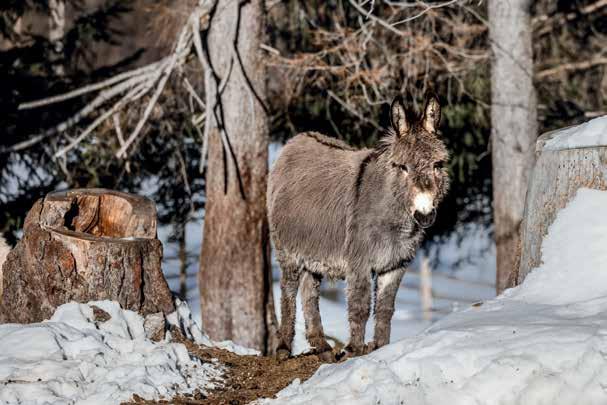 Weil für alle ihre Tiere im Stall nicht Platz wäre und Freilauf gesund ist, gibt es neben dem Hof im Wald einen Unterstand. Die Esel bleiben im Freien, „sie tappeln den ganzen Tag durch die Gegend und gehen der Sonne nach.“