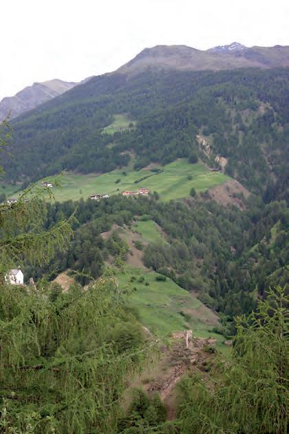 Im Vordergrund die Ruinen der Matscher Schlösser, in der Mitte die Runhöfe und rechts die Schlucht des Aviunsbaches