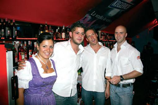 Treindler unter neuer Führung: Geschäftsführer Thomas Kusstatscher, links im Bild mit Barkeeper Maik; Barkeeper-Team: Tina, Manni, Maik und Marco; rechts: Maik sorgt für’s Saftl mit Schuss! Für Stimmung letzten Donnerstag sorgte DJ Patex. Sichtlich ging es schon am Eröffnungsabend heiß her.