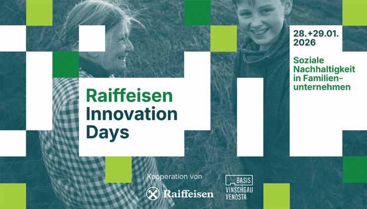 Am 28. und 29. Januar: Zwei Nachmittage voller Impulse, Austausch und praxisnaher Workshops in der BASIS Vinschgau Venosta. 2026 startet mit guten Nachrichten für die Vinschger Familienunternehmen: Die Raiffeisenkassen des Vinschgaus und BASIS Vinschgau Venosta haben gemeinsam ein praxisnahes Bildungsformat entwickelt, um Familienunternehmen zukunftsfähig und finanziell sicher aufzustellen.