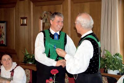 Bild unten: Guido Barolini (Pro Engiadina Bassa) überreichte Andreas Tappeiner als neuen Präsidenten der Bezirksgemeinschaft die Terra Raetica Fahne, welche nun unter Vorsitz des Vinschgaus weht