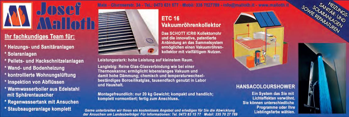 nement im Vinschgau: Euro 20; außerhalb des geogrfischen Bezirkes Vinschgau Euro 30; restl. Italien und Auslandsabonnement: Euro 100 (Inkl. Porto); Schweiz: Sfr 95.Mit Namen gekennzeichnete Beiträge geben nicht unbedingt die Meinung der Zeitung wieder Im Sinne des Art. 1 des Gesetzes Nr. 903 vom 9.12.1977 wird eigens darauf aufmerksam gemacht, dass sich sämtliche in dieser Zeitung veröffentlichten Stellenangebote ohne jeden Unterschied auf Personen sowohl männlichen als auch weiblichen Geschlechtes beziehen. Die Redaktion behält sich das Recht vor, Anzeigen und Leserbriefe unter Umständen zurückzuweisen. Für die Inhalte der Werbeinserate und die damit zusammenhängenden Werbebotschaften übernimmt „Der Vinschger Wind“ keine Verantwortung. Druckreif übermittelte Unterlagen (Papierkontakte, Filme und digitale Daten) können seitens der Anzeigenabteilung nicht korrigiert werden. Für die Richtigkeit, sei es in grammatikalischer, stilistischer, inhaltlicher und grafischer Form haftet ausschließlich der Auftraggeber bzw. die beauftragte Agentur.