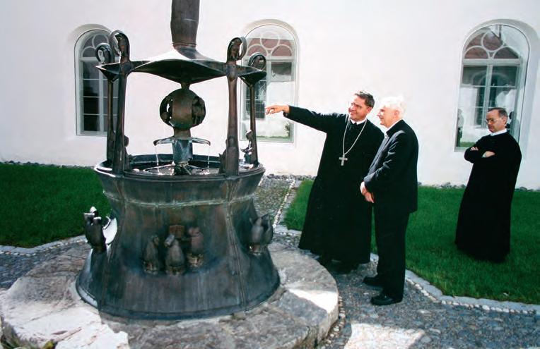 Marienberg: Der damalige Kardinal Joseph Ratzinger - der heutige Papst Benedikt XVI. - im Kreuzgarten von Marienberg zusammen mit Abt Bruno Trauner und Pater Martin Angerer