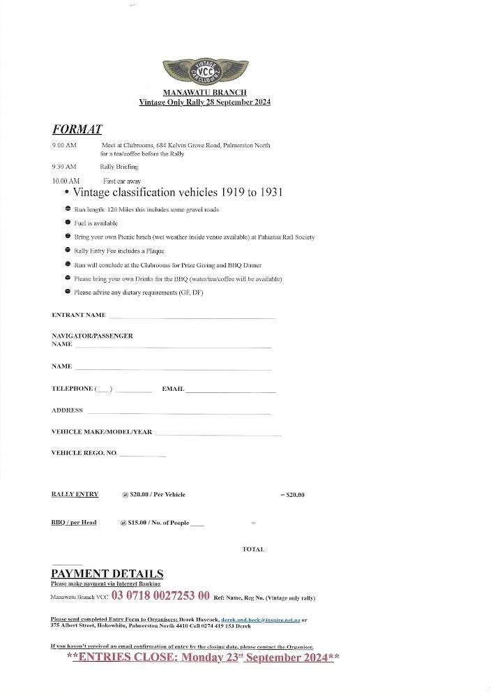 The Waikato Branch of the VCC NZ cordially invite you to partici-pate in this year’s Veteran Rally to be held on Saturday the 9th Nov 2024 The rally is based on sealed roads. Both a short route and a long route will be offered for both the morning and afternoon runs. For example the short route morning run will be 30 miles plus, easy going. The long route will be 50 miles, both easy going.