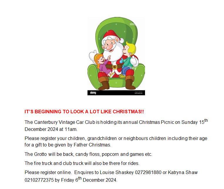 The Christchurch Machinery Club is preparing floats for this year's Santa Parade on Sunday 24th November. The Chitty Chitty Bang Bang is one of the prime floats, and they would like two vintage-era Tourers to accompany the float in the parade - one in front and another behind. The parade is held in the A&P Showgrounds. The float is towed by a tractor at 5km/h and does one circuit of the showground. The tourers can have passengers (grandchildren?), and can have appropriate VCC regalia attached.