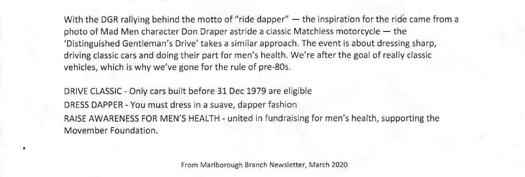 The first worldwide outing for the ‘Distinguished Gentleman’s Drive’, which included BLENHEIM New Zealand, one of only two NZ sites invited to join, was planned for May 31, 2020.