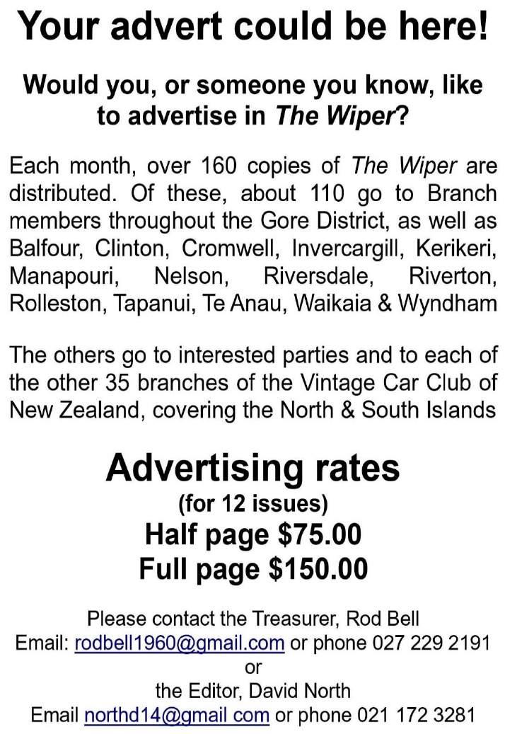 If you are prepared to organise a Rally / Run and the activity / criteria for the awarding of trophies please give the Vice-Chairman a call or text on 027 229 2191 or email rodbell1960@gmail.com. Privacy issues prevent me from being able to contact you unless your contact details are freely available in The Wiper. Rod Bell