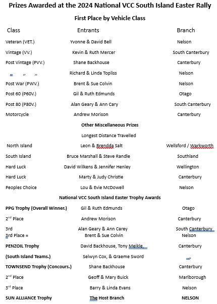 As a consequence, I will feature the Post Easter Rally Tour to Golden Bay and the Sandy Bay Hill Climb in the next edition. Thank you to those that have contributed photos and articles - they also are very much appreciated.