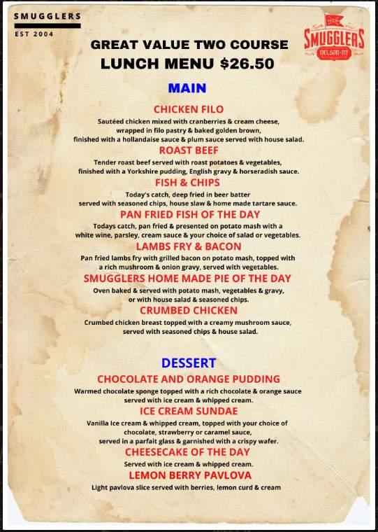 The run will finish at Smugglers in Tahunanui for a two course meal and trophy presentation. Entrants will pay for their own meal - a great menu to choose from on opposite page.
