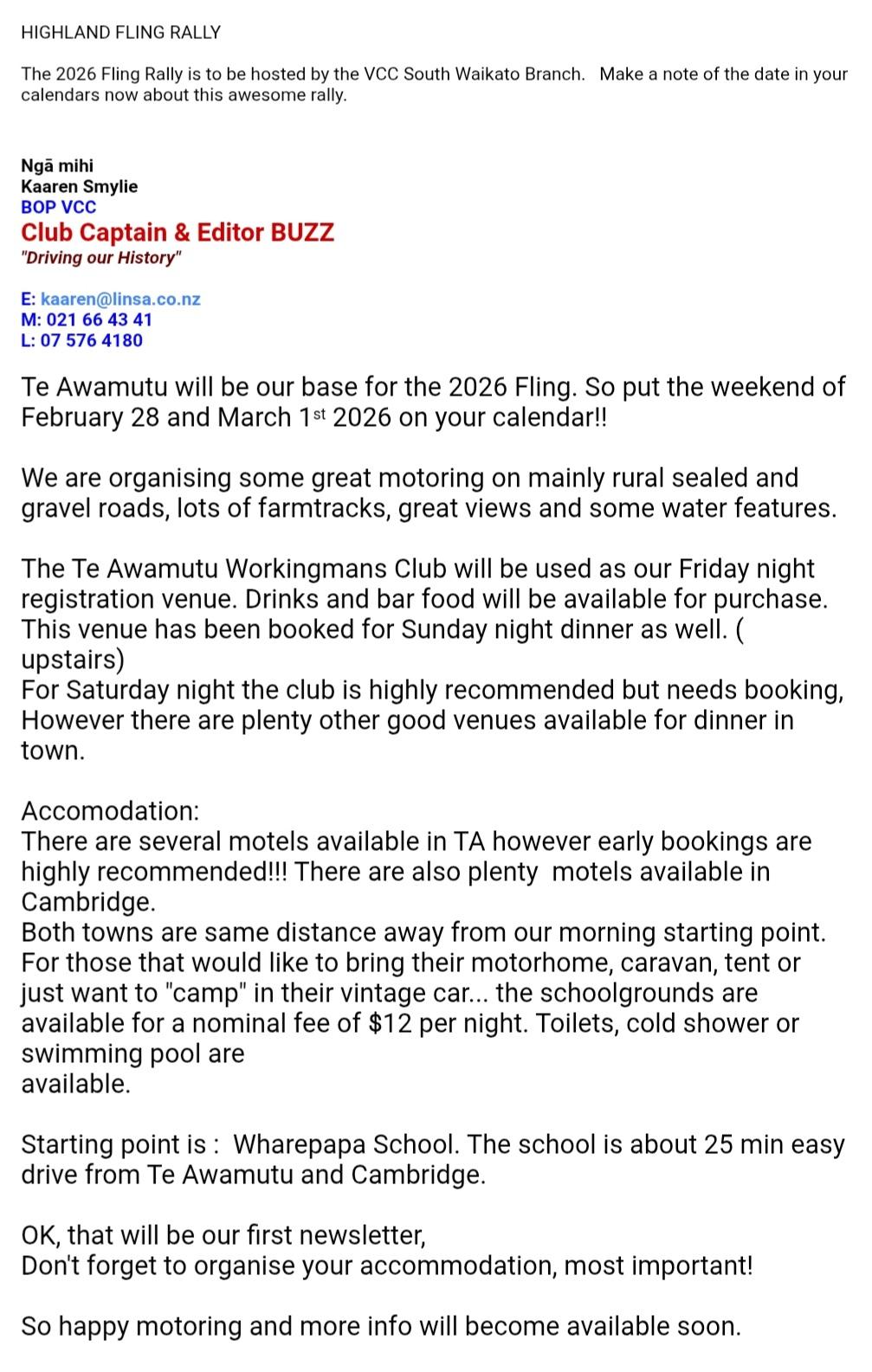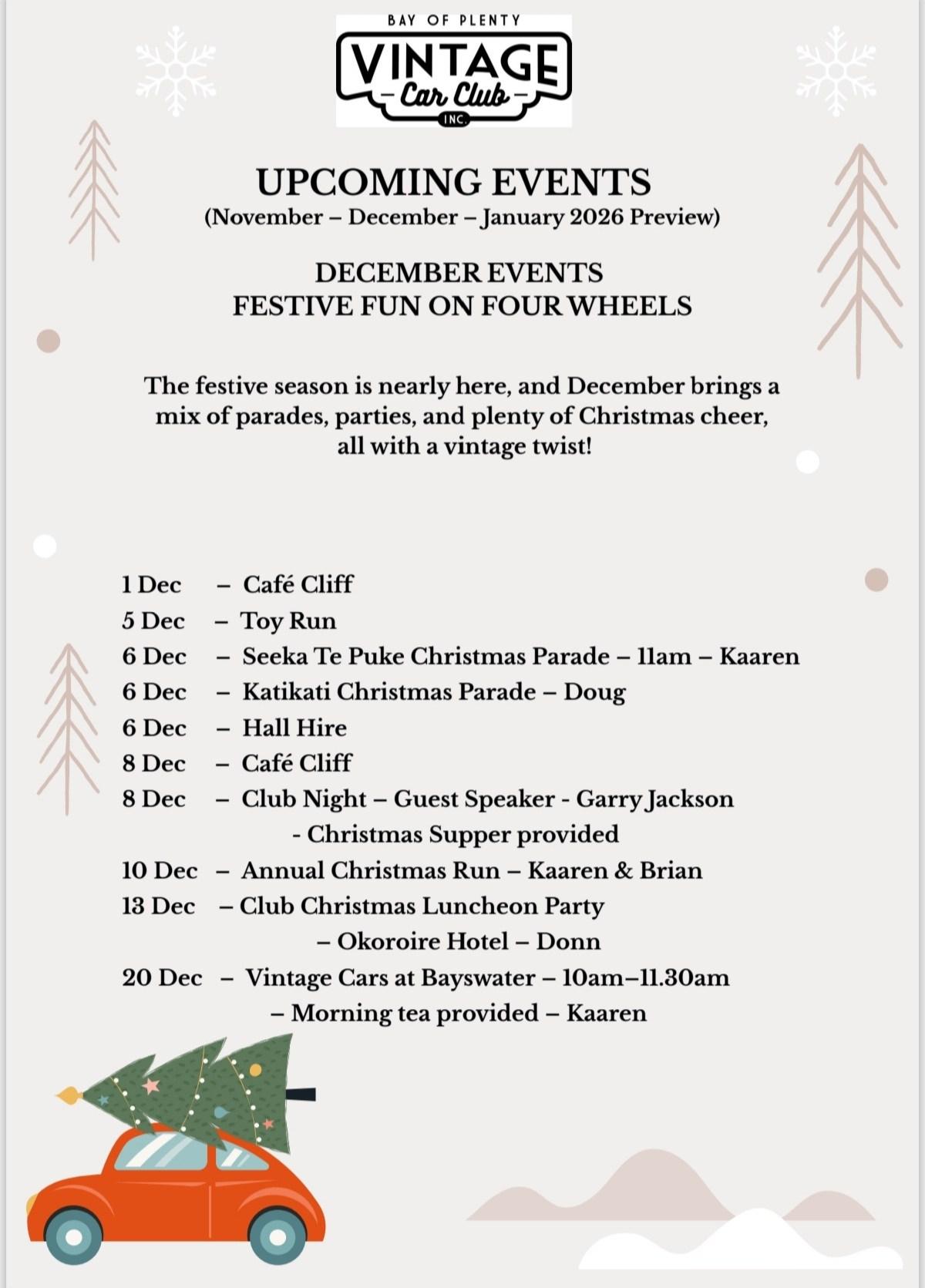 The Christmas lunch and run to the Okoroire Hotel has been confirmed for 13th December with an eighty seat setting.