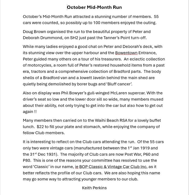 The Mid Month Run (shed run) organised by Doug Brown to Peter and Deborah Drummond’s collection of cars, tractors, motorbikes , clocks and radio/tv’s was heartwarming with around 55 vehicles and 100 members enjoying the camaraderie and with about 35 heading to the Waihi Beach RSA for lunch gathering. A pat on the back to you all. If you didn't turn up, then you missed a great day.