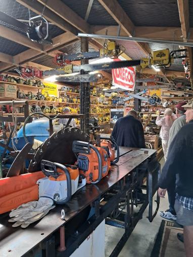 By appointment only, the first visit was to Keith Hartstone’s chainsaw collection, collected over more than 20 years. There were more than 500 chainsaws and saws of all different sizes and ages, and the history that went with all the individual saws. They offered us coffee, tea and cake, very welcoming.