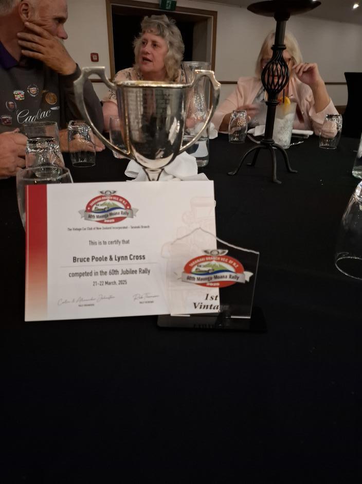 Glyn Clements (North Island Club Captain) presented two fifty year awards, one of them to the husband of Juliet Bellerby (daughter of Snow and Sue Bellerby from Wanstead) who came over to chat with us. I would have met her some time ago in Waipukurau. As the prizegiving proceeded, Bruce Poole and Lynn Cross came out as winners of the Vintage Section. The wins keep coming, pure luck!!, We had a good night with an excellent meal and good company with Horowhenua Club members who may be up for Neil and Pat’s Twilight Rally and for our Vintage Only Rally in September. This meeting with other branch members is a must if we want entrants for our rallies, but we must also travel to other branches. Altogether, it was a great weekend and a big thank you to Lynn Cross for excellent company and navigation.