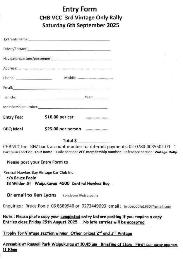 Saturday6thSeptemberisFathers’DayandthedayafteristheCentral HawkesBay3rdVintageRallyinWaipukurau,assemblyat10.45amfor11am briefingandstart.BYOlunchandthecompetitivepartoftherallybeginning 1.30pmfinishingfordinnerandpresentations.Entriesareontheboard.
