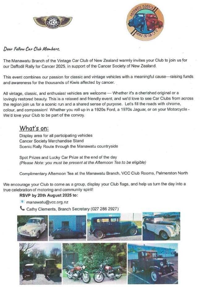 OnSunday24thAugustisTheVCCNationalDaffodilDay. ThisyearManawatuaredelightedtohaveusonboardwiththem.We willbejoiningtogetherpromotingourVCCClubsandatsametime raisingalittlemoneyforCancerSociety.GlynClementshasthisunder controlandI’msureourmemberswillassistwherenecessarypossibly withmarshalling.