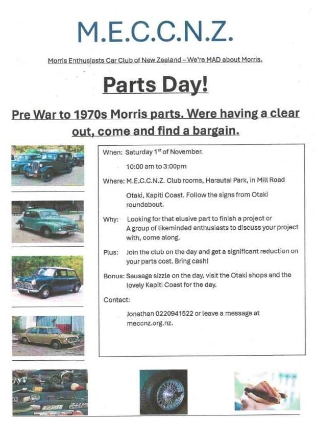 The Manawatu Swap Meet on Saturday 27th September was another outing where we could catch up with a lot of Horowhenua members. There appeared to be more talking than buying, but I’m sure a lot of members came away with some treasures. Two of our members entered the Rex Porter Memorial Rally in Masterton on the 5th October, and it will be interesting to hear how they got on at our next club night. By all accounts the weather was not too kind during the weekend over in the Wairarapa. Coming up: