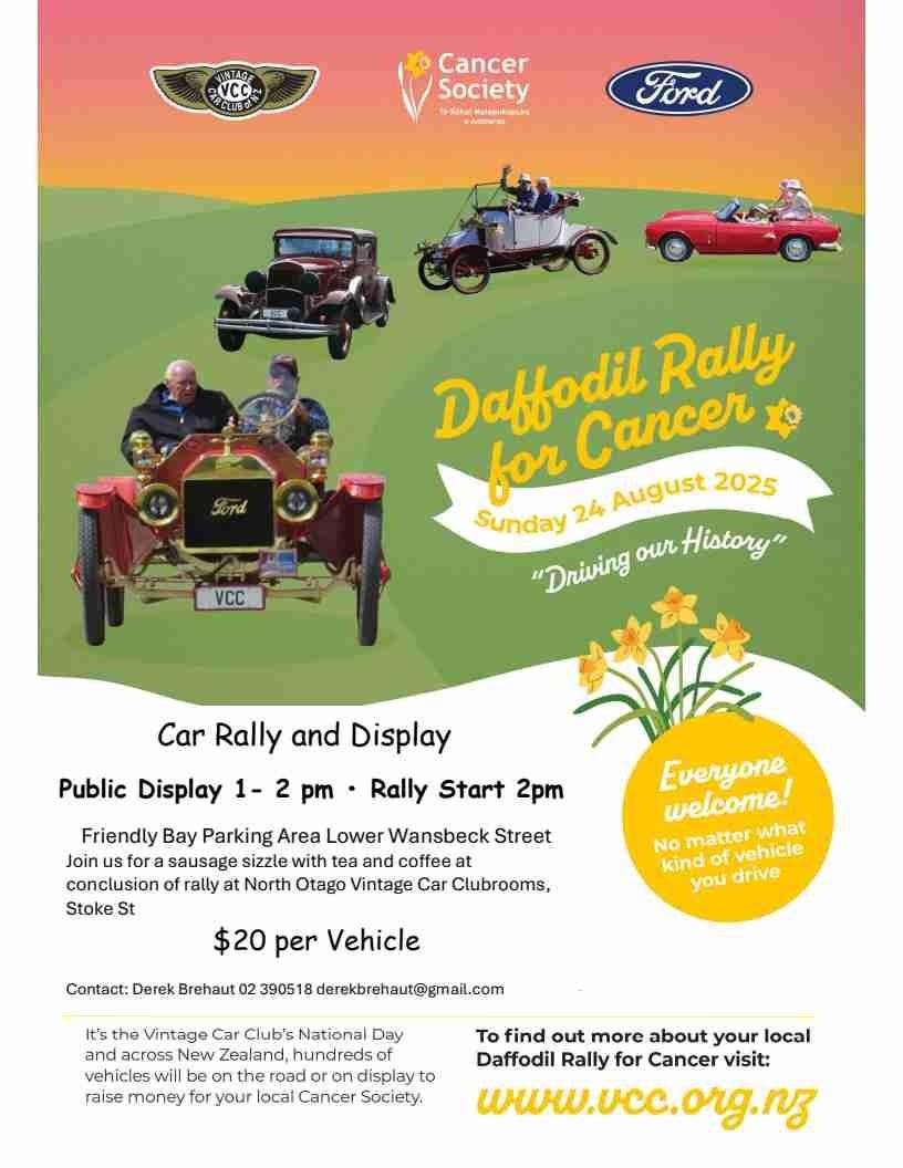 The Organising group are looking for marshals on the day to direct traffic, so if this is something you may like to do please contact any of the committee members. This event is open to all vehicles regardless of age so please let your friends and neighbours know. $20 per vehicle, all funds going to our local branch of the Cancer Society so the more vehicles the greater the donation. If you belong to another club or group we have flyers available for you to spread around to encourage others to participate.