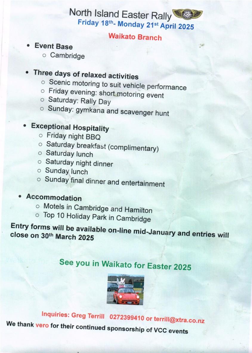 National Events. Check Beaded Wheels for details or NZVCC website. North and South Island Easter Rally 18th,19th and 20th April 2025