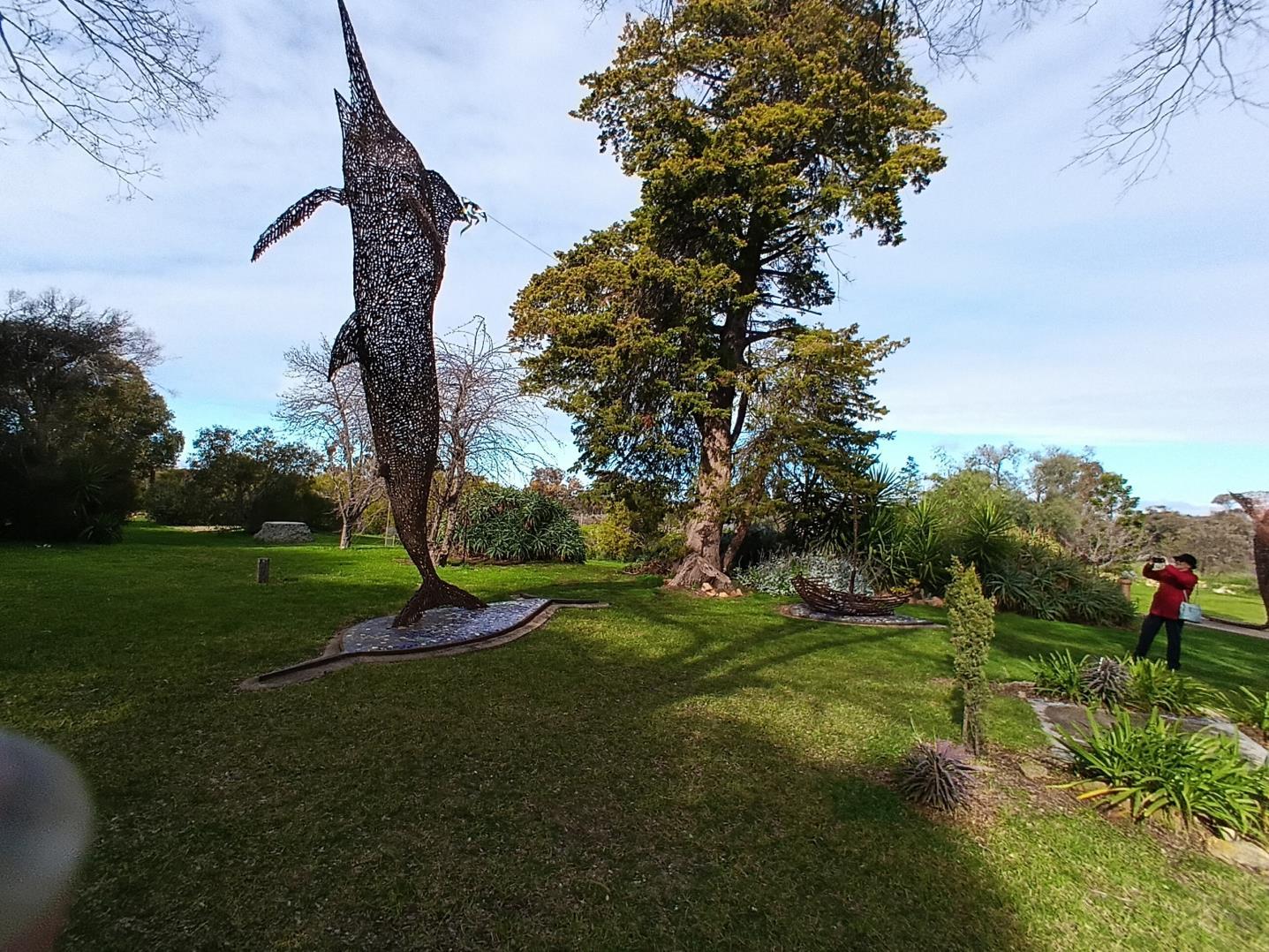 These are larger than life sculptures as can be seen with this Marlin. That’s Lynette in the red coat on the right taking another photo. There’s a small boat just to the left of her with a fishing pole in it attached to a wire going up to the fish with a lure just by the dorsal fin.