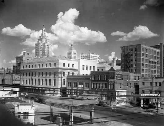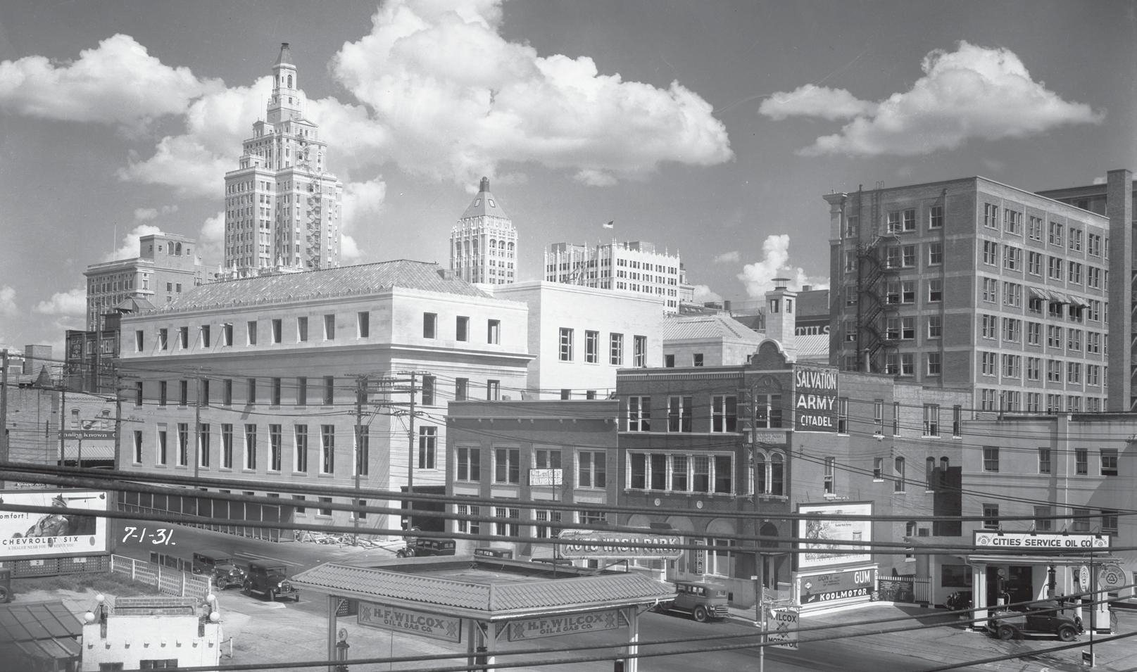 The downtown Tulsa skyline in 1931 included the Federal Building and U.S. Post Office, Cities Service Oil Company, the Salvation Army, the National Bank and Trust, and the Philtower.