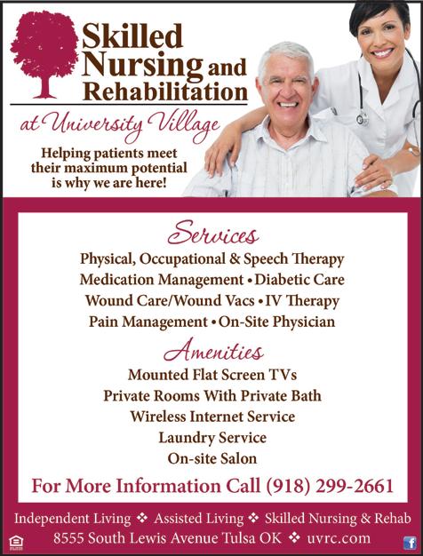 www.LIFEseniorservices.org LIFE’s Vintage Newsmagazine | September 2023 7 1251 W. HOUSTON STREET • BROKEN ARROW, OK 74012 539.367.4500 • 539.367.4510 (F) • WWW.ASPENHEALTHREHAB.COM Northeastern Oklahoma’s newest, premier skilled nursing and long-term facility, located in Broken Arrow, OK. We Offer Rehabilitation Respite Long-Term Services Physical Therapy Occupational Therapy Speech Therapy Call us today to see how we can make a difference! Enjoy a relaxed, carefree lifestyle that renews your vitality and lets you pursue your passions in the endlessly inviting Tulsa area. Experience the Covenant Living difference—schedule your tour today. Call (877) 478-8455. Senior living with promise. LIMITED AVAILABILITY! • INDEPENDENT & ASSISTED LIVING • SKILLED NURSING • MEMORY CARE • REHABILITATION CovLivingInverness.org Celebrating ZERO deficiencies in Healthcare!