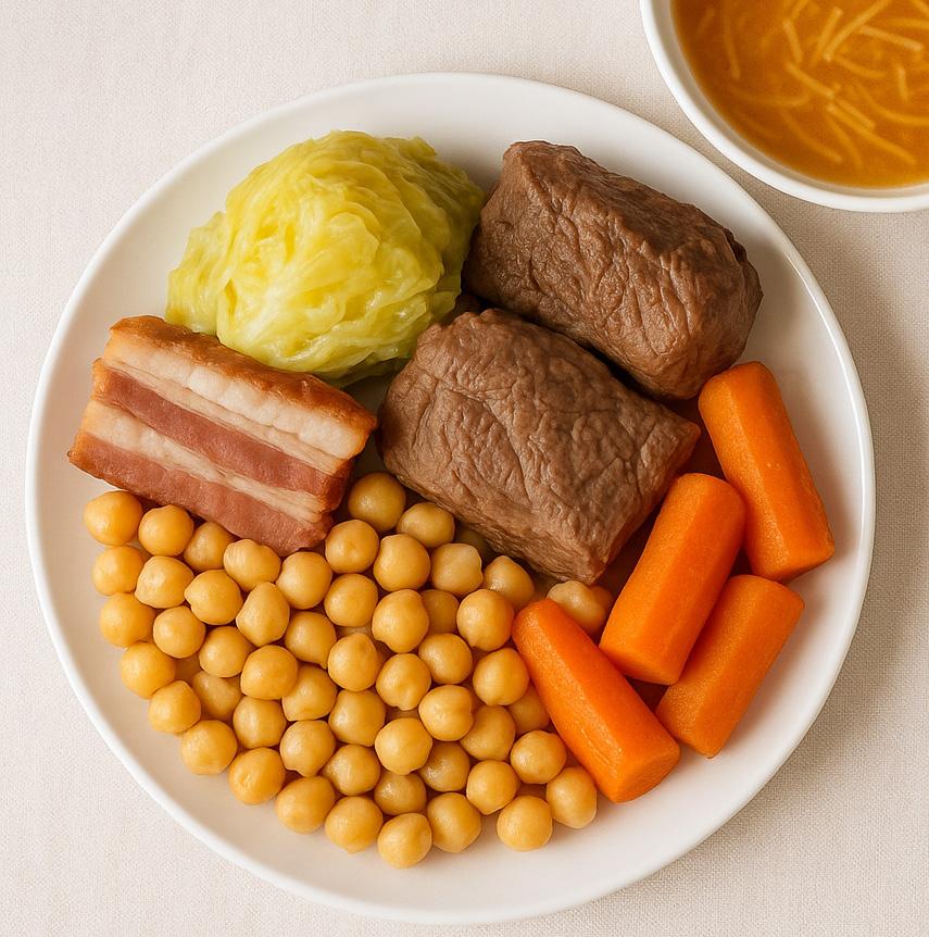 Hueso de Jamón añejo Tocino, ternera, chorizo, pollo. Repollo, patata y zanahoria (para justificar llamarlo “comida equilibrada”)