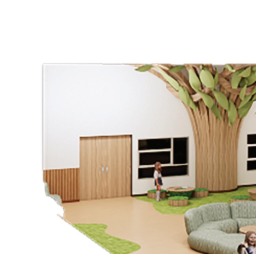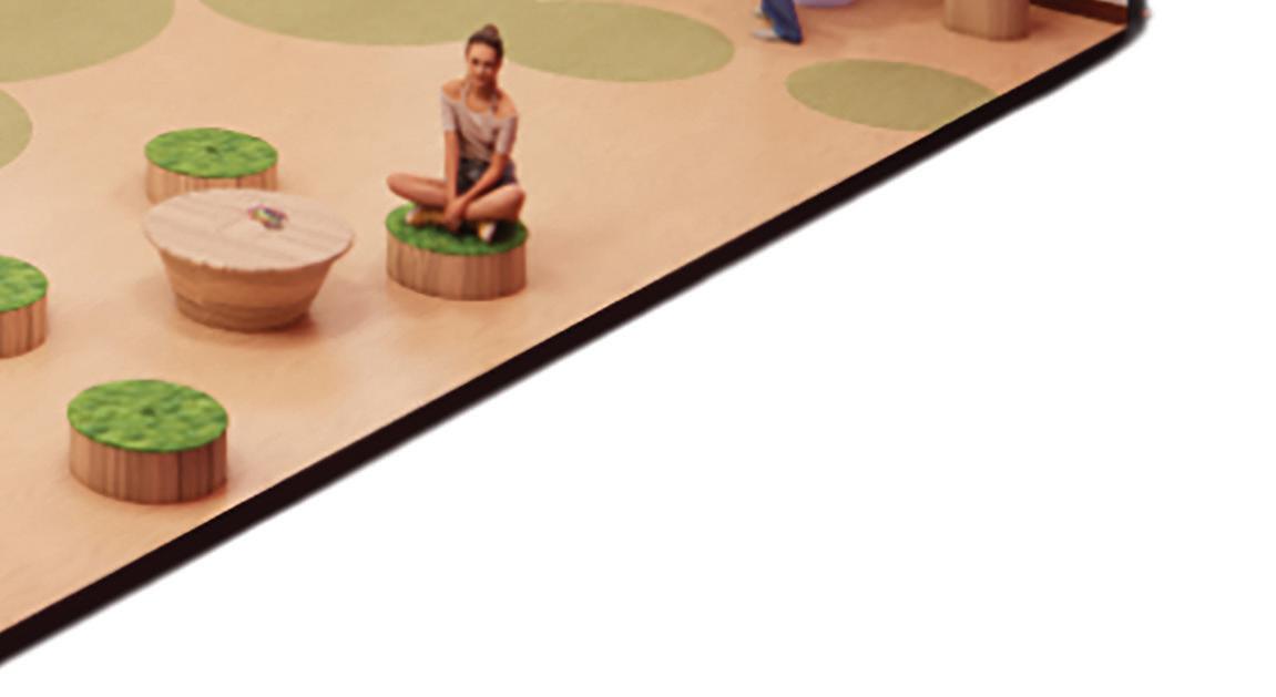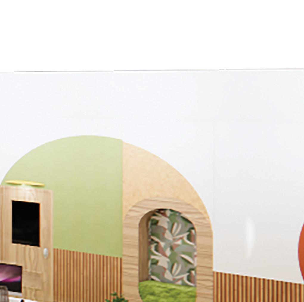 Insighting an atmosphere of adventure and curiosity as one travels deeper within the space through rounded corners, edges and softer colors. Safety in mind, all furniture pieces are weighted down, ceiling features at a minimum of 8 feet, and all surfaces are tamper proof.
