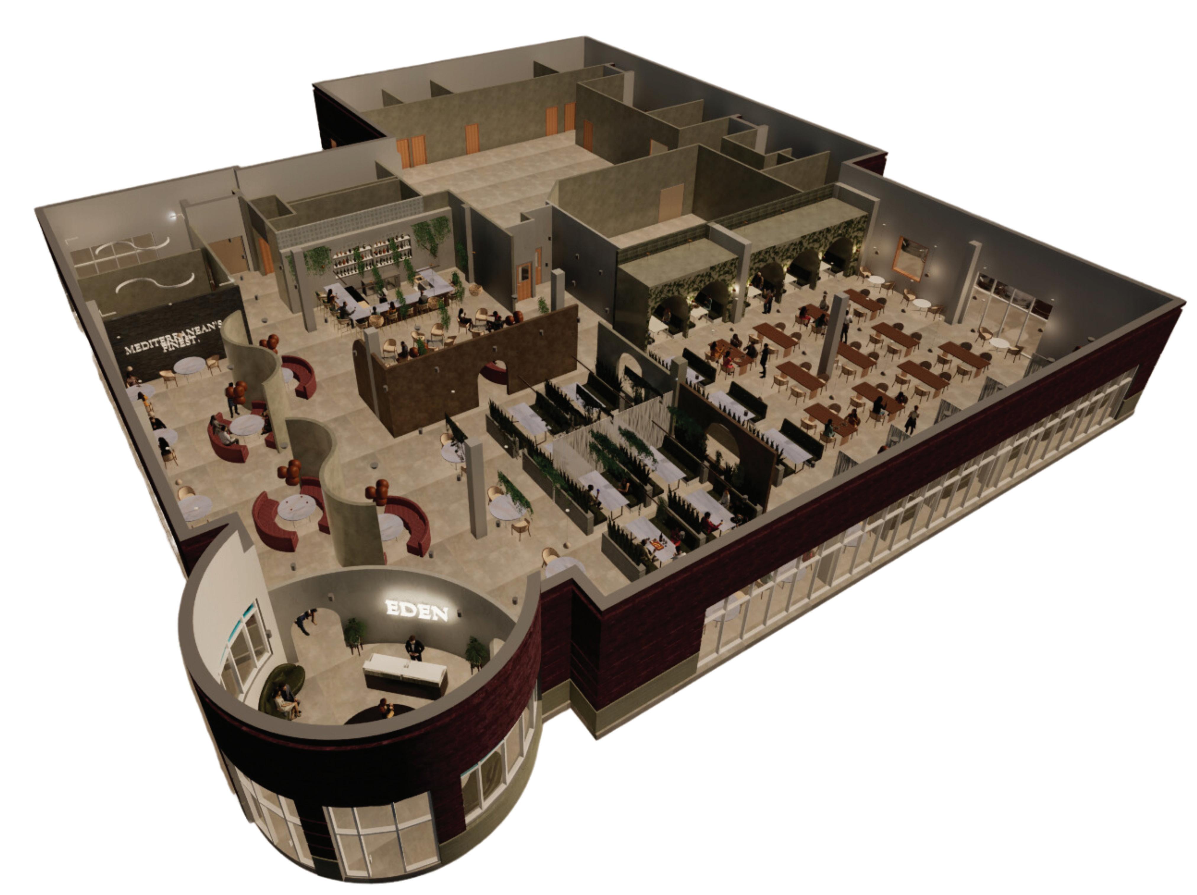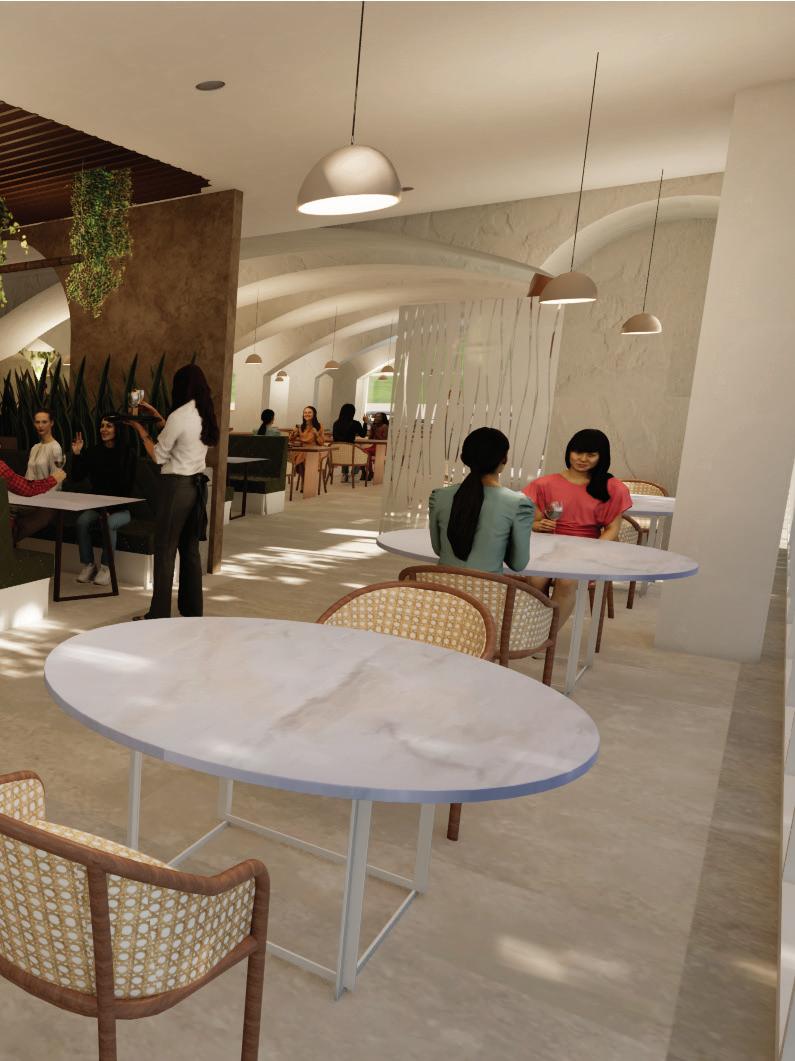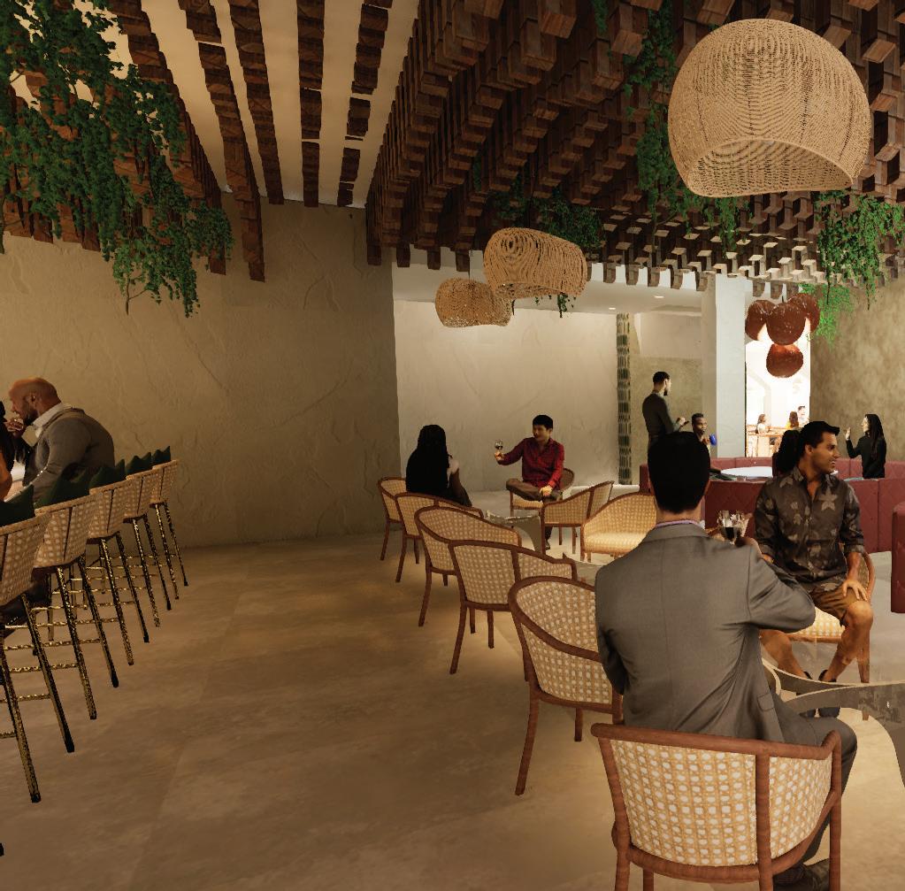 Implementation of design tools in the resturaunt are envisioned through a cultural lense, biophilia is used in high traffic areas, foliage featured designs, in tandem with archways that encompass biomorphic forms.