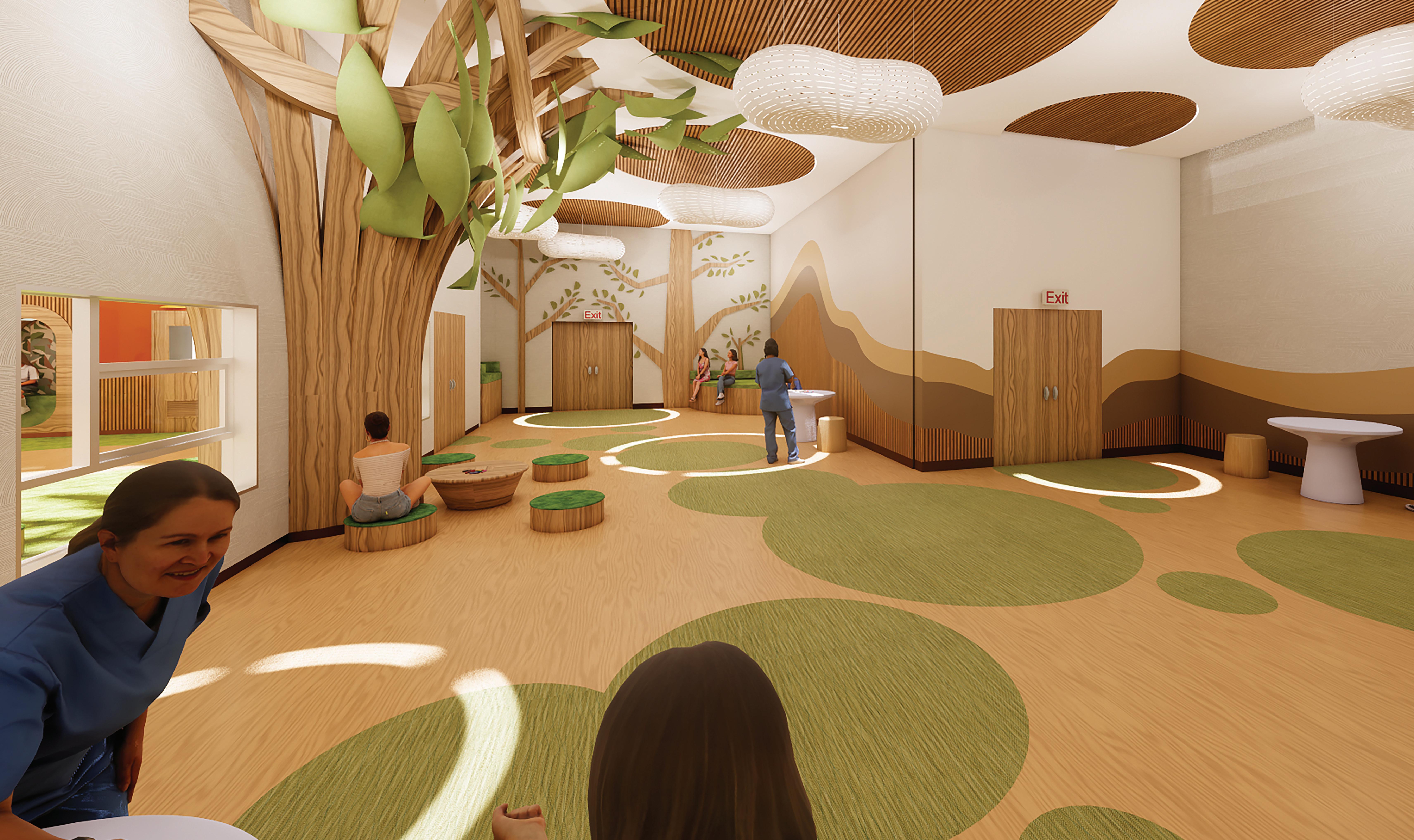Supplemented by acoustical treatment , soft-to-touch elements & sensory led wayfinding techniques. Color theory is put into place in differing interactions of the space ranging from quiet zones for patients to group activity room.