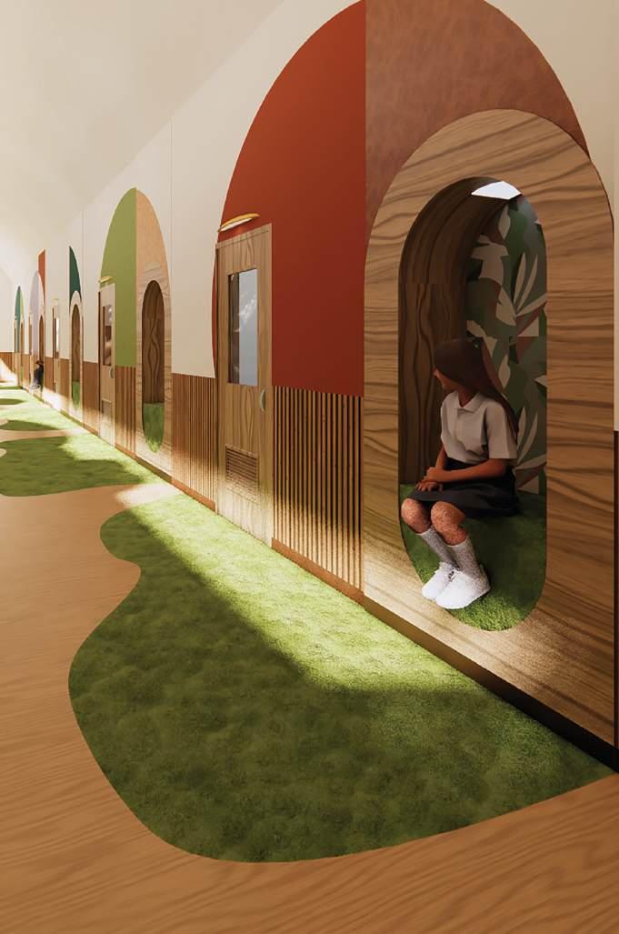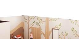 Insighting an atmosphere of adventure & curiosity as one travels deeper within the space; using rounded corners, edges and softer colors. Safety in mind, all furniture is weighted down, ceiling features at a minimum of 8 feet, and all surfaces are tamper proof.