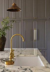 immediately sets a relaxed tone. Whitewashed floors reflect natural light and create continuity throughout the space. Oak cabinetry adds warmth while plaster elements bring softness and texture to the architecture. Antique brass accents appear thoughtfully throughout the home, offering a subtle sense of age and familiarity that keeps the interiors from feeling too polished or formal. Together, these materials create a livedin elegance that feels intentional and enduring.