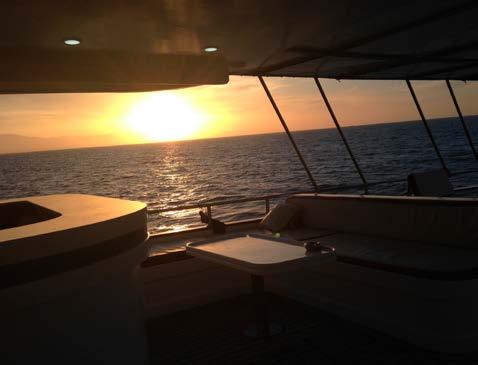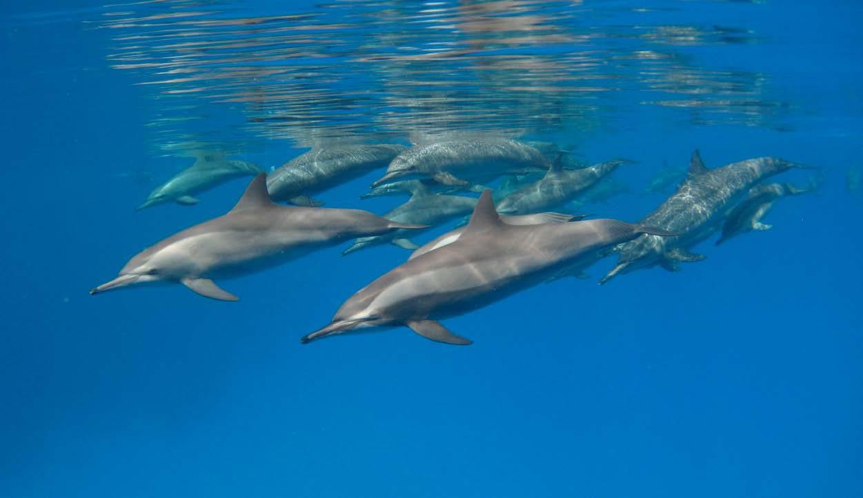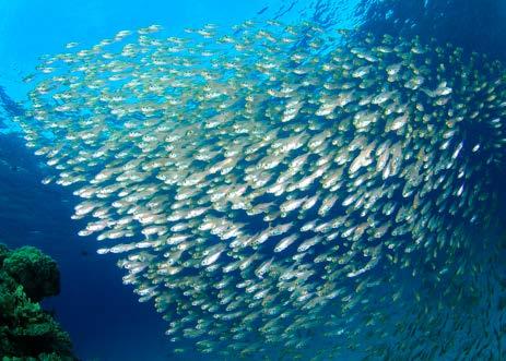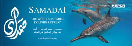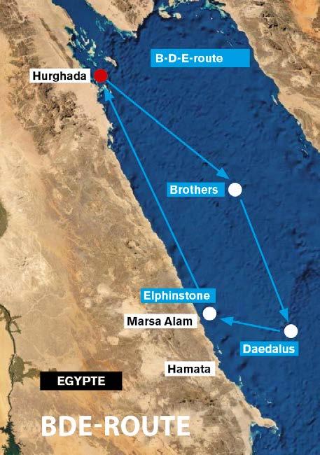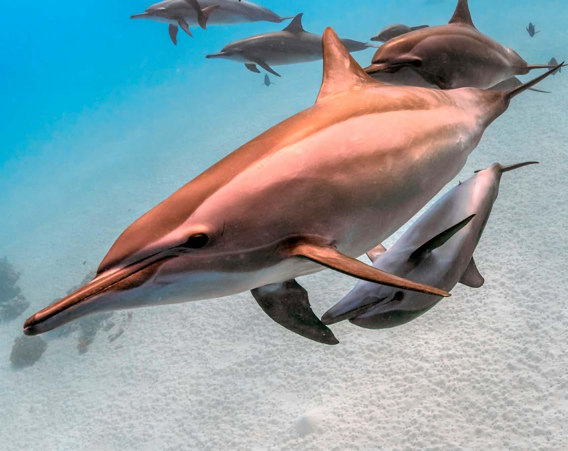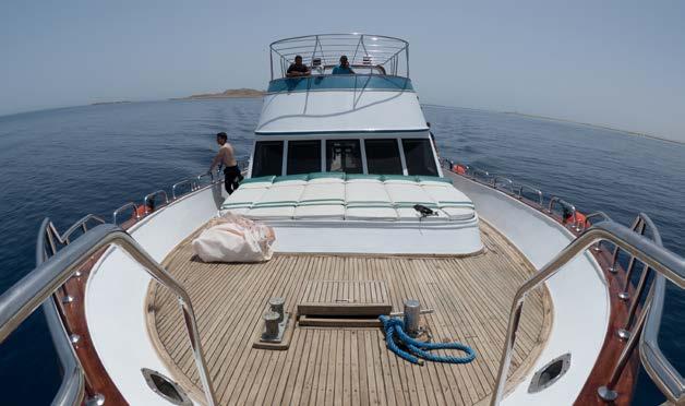 een BBC-documentaire bevind. Koraalduivels, papegaaivissen, roggen en schildpadden… Het is een waar paradijs. Het is geweldig om hier te midden van dit overvloedige rifleven te mogen zweven. De meeste gasten aan boord hebben al veel gezien, ze kennen de duikspots bij de Sinaï, de riffen in de Straat van Tiran, Gordon Reef, Thomas en Woodhouse Reef en al die andere bekende spots. Maar wat we hier zien vlak bij het woestijnstrand van Tiran Island op dit haast ongerepte koraalrif, is ongelooflijk. Helaas komt aan elke droom een eind, maar die van ons duurt nog even iets langer voort dan verwacht. Wanneer we de baai uitvaren, horen we geluiden bij de boeg. Ik ren naar voren en ja hoor! Vinnen en nog eens vinnen, glinsterende lijven die uit het water omhoog komen. Een enorme school van wel 100 dolfijnen, waaronder moeders met hun jongen, vliegen spelend door het water. Ze draaien pirouetten, wedijveren om de beste plaats op de boeggolf en genieten duidelijk van het spel met de boot. De kapitein draait rondje na rondje en vormt cirkels in het schuim. De boot is de speelbal van de dolfijnen. Deze momenten blijven me voor altijd bij.