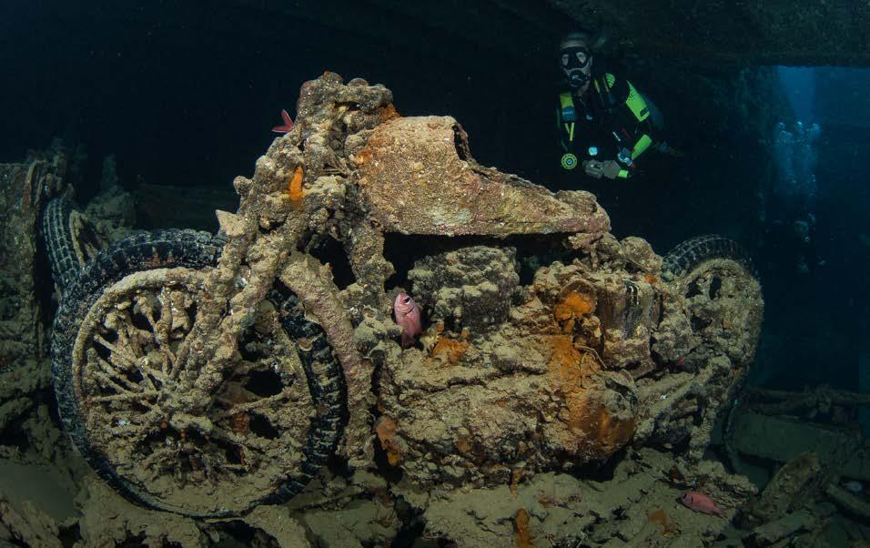 tekort komt. Na een oppervlakteinterval gaan we tijdens de tweede duik op de Thistlegorm de enorme scheepsruimen verkennen. Dit is de plek waar de auto en BSA-motorfietswrakken nog onaangetast geparkeerd staan. De vele BSA-motoren zijn weliswaar overwoekerd door koraal, maar nog steeds herkenbaar en gedetailleerd. Ongelooflijk, wat een duik!