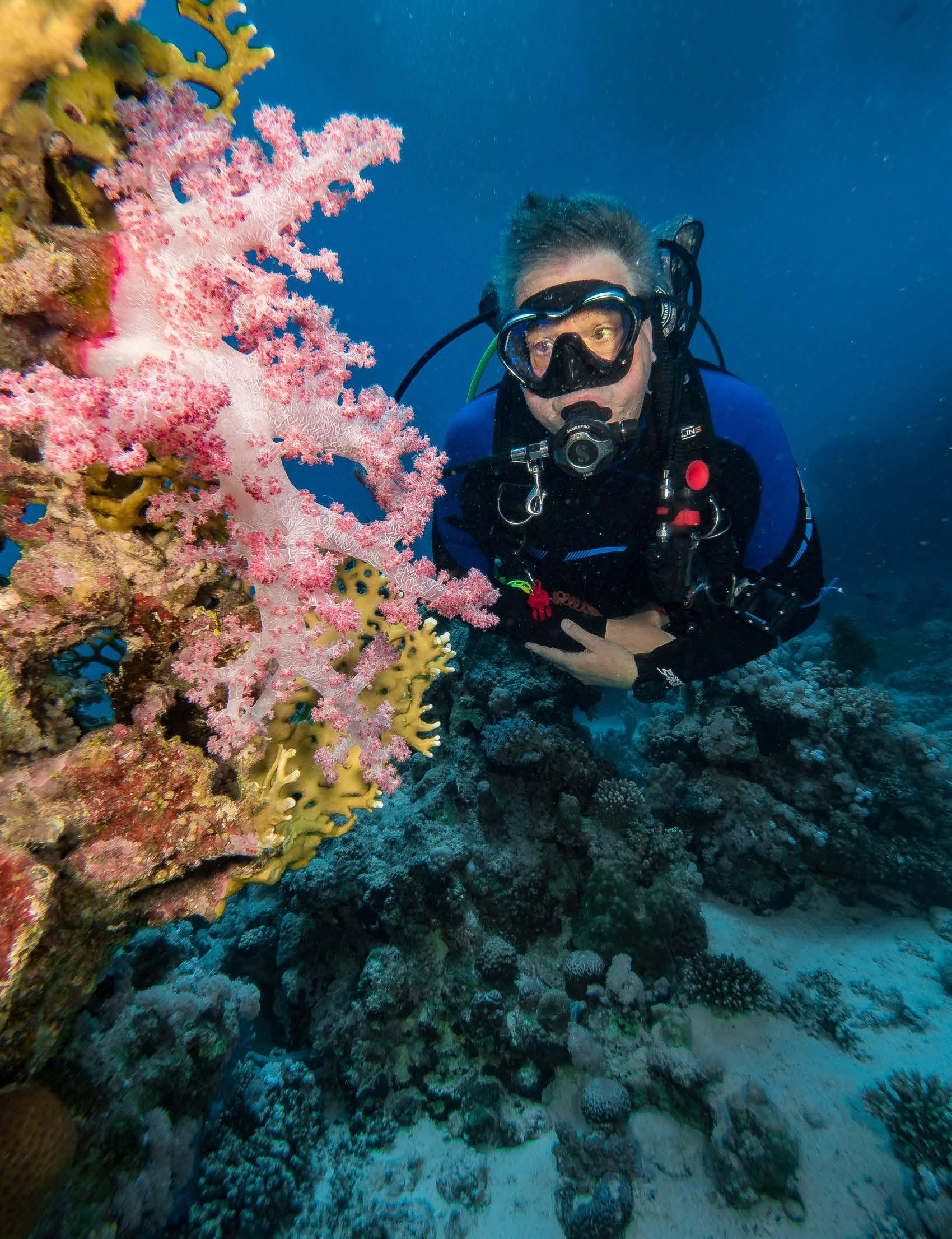 Het water heeft – zoals overal in de Rode Zee – een lekkere temperatuur. We dalen af en al snel bereiken we het rif dat parallel aan de kustlijn loopt van het eiland. Alle kleuren en vormen koraal strekken zich uit tot zover het oog reikt. Als ik even omhoog kijk, zie ik zonnestralen dansen in het tegenlicht. Elke nieuwe bult in het rif wekt mijn nieuwsgierigheid; je weet maar nooit wat er te zien is of wie daar woont! Zwemmend doorkruisen we canyons en de scholen vissen die we tegenkomen zijn alles behalve schuw. Het lijkt wel of ik me in