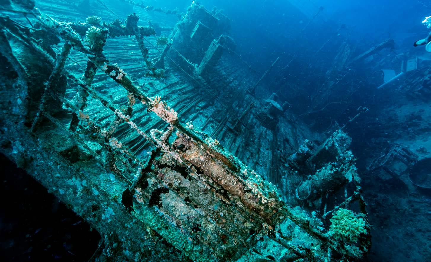 dieper gelegen achterdek dalen we af naar de zandbodem, waar op 30 meter diepte twee locomotieven liggen, 50 meter van het wrak verwijderd. Via de achtersteven komen wij vervolgens bij de immense schroef uit. Dit 130 meter lange wrak ligt hier al sinds 1941 en heeft de ‘tand der tijd’ goed doorstaan en is inmiddels overwoekerd door vooral veel zachte koraalsoorten. Door de talrijke vissoorten die hier huisvesting hebben gevonden, is dit gigantische scheepswrak een ware metropool geworden waar je ogen en tijd