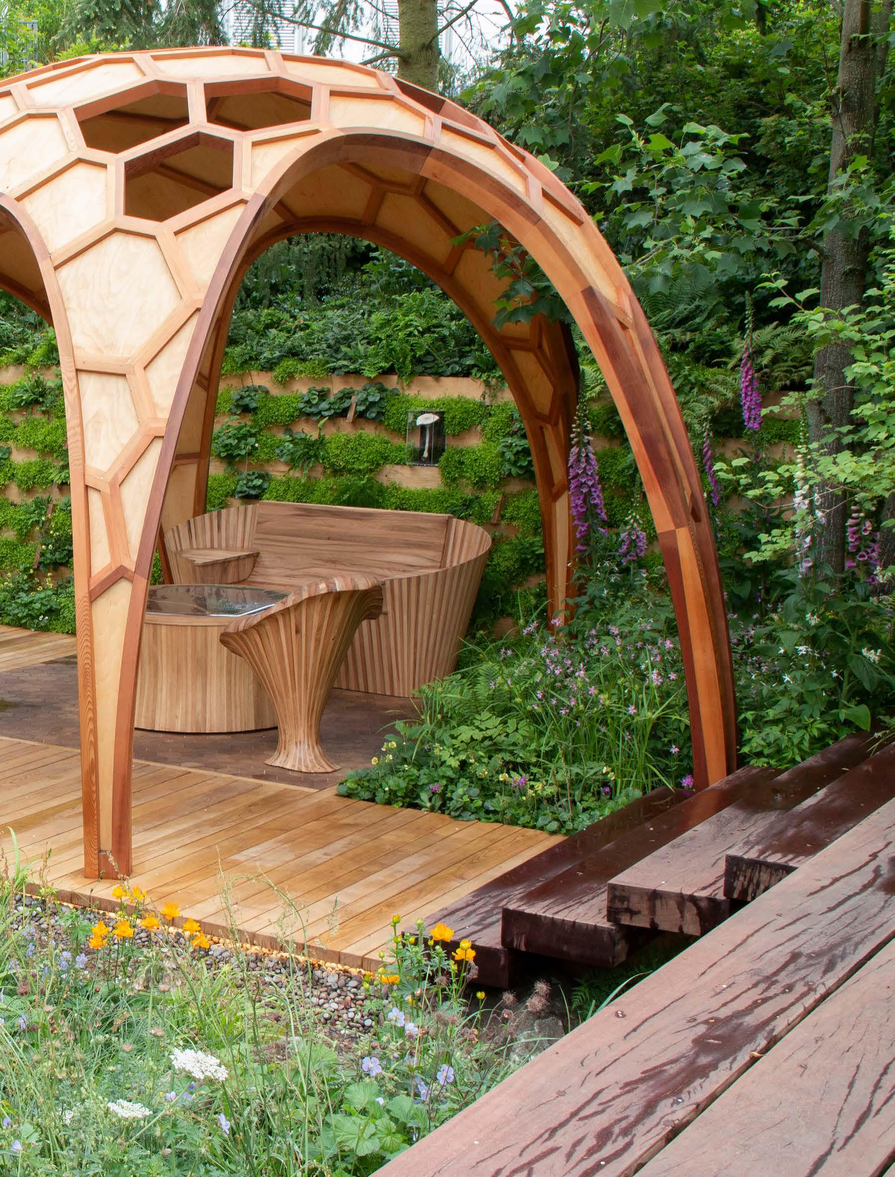 Ronde lijnen en geometrische vormen gaan hier hand in hand. Het paviljoen - met een patroon geïnspireerd op een honingraat – maakt de zitplek een stuk intiemer. De tuin ligt grotendeels verdiept en dat zorgt voor een extra knusse sfeer. De groene wand achter het paviljoen is beplant met varens en andere planten die van schaduw houden.