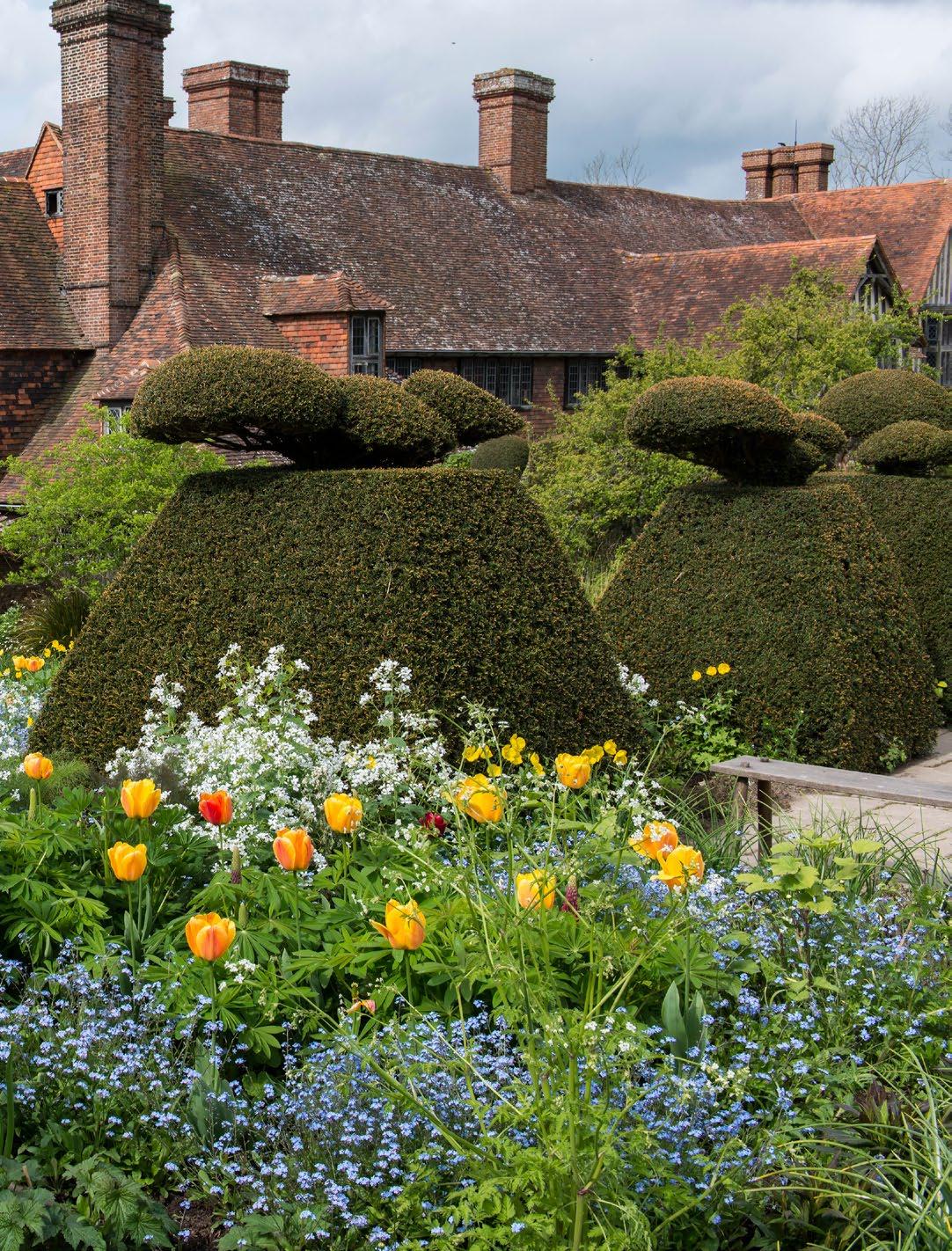 Bij Great Dixter draait de voorjaarsborder om contrast en timing. Tussen de blijvende structuren van strak gesnoeide taxussen in pauwvorm verschijnen nu de eerste kleuraccenten. Voorjaarsbollen zorgen voor kracht en ritme, terwijl de luchtige, tweejarige damastbloemen de overgang naar de zomer verzachten. Zo oogt de border nu fris en levendig, maar blijft hij ook later in het seizoen interessant. En het leuke is: erg ingewikkeld is deze beplanting niet.