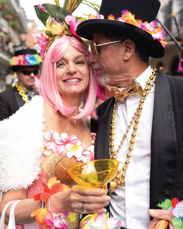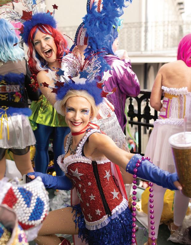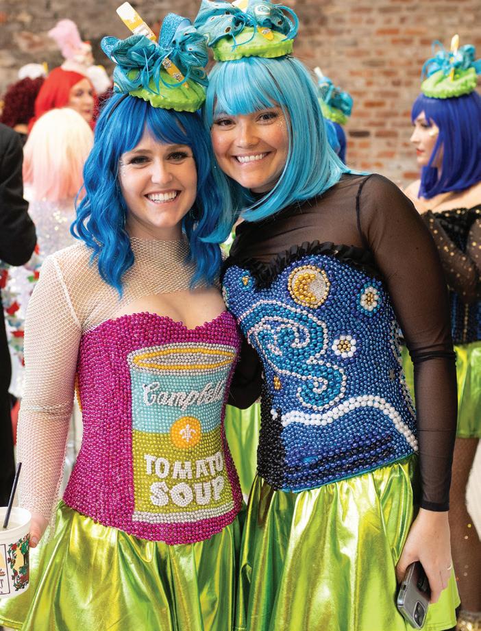 on preparations for next year. Together, we brainstorm themes, discuss ideas on how to improve and continue to build our organization, and begin planning. The royals’ duties also include communication through email, sourcing accessories, illustration design boards of bustiers, designing t-shirts and specialty throws and providing guidance to their groups. The captains also help the ladies in their group with bead parties, advice, and are in charge of our annual masquerade ball, which is always fabulous. From there, it is a very busy year! My daughter Claire and I work to reserve the venues for our events for the year—the Hat Party, Masquerade Ball and Grand Luncheon, as well as hotel accommodations and balcony space. Additionally, we get insurance for the group, hire photographers, security and a jazz band, secure all permits and ensure we have a police escort. There are a lot of moving parts. And once our theme is decided, I start designing the headpieces.”